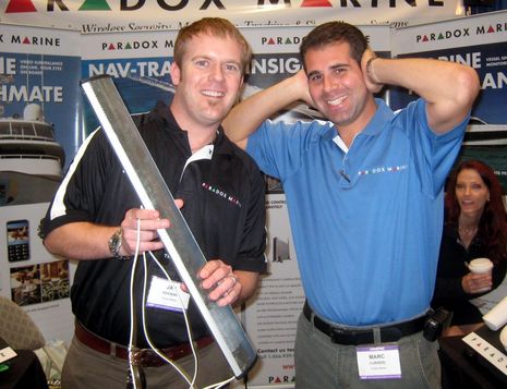 WatchMate is just one security/monitoring product in Paradox Marine's ever growing portfolio. (In fact, the only such systems I can think of that are not put together or at least distributed by Paradox are Boatsense Solutions, Sea Key, and Maretron's N2KView.) At every show these guys seem to have some new system or add-on gadget. In Miami it was that non-lethal acoustic weapon being mugged over below. It could not be demoed because the sound supposedly makes people forget whatever they're up to --- be it stealing or reporting --- and flee. I'm not sure if this gadget is a genuine LRAD (Long Range Acoustic Device), which seems specific to one manufacturer (and is well explained in this gCaptain video), but it certainly sounds related. It can be set up in your cockpit as an extension of a Paradox security system, or can be had on its own along with a motion detector and a remote control so you don't get your own mind melted when you return to your boat. I'm sure details will be on the Paradox Marine site soon.