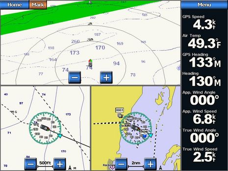 Now, about my N2K wind system testing. First of all, take a good look at that Garmin screen above. GPS and Heading are coming from the Airmar PB200, and Apparent Wind from Garmin's own GWS 10 (it was easy to choose any of the five sources on this 5212 or on the GMI10). Note how well the data lines up, even in quite light air. The situation seen below is even tougher; I'm running at 5 knots with 3-4 knots of True Wind on the starboard quarter. I think the level of sensor agreement is pretty remarkable, but there are issues with even a visual comparison. The ST70 wasn't really useful as I couldn't tell which sensor it was using and, besides, I don't think it will calculate True Wind relative to boat with SOG instead of STW. (Raymarine's software update may deal with these issues, and Gizmo will soon have an N2K paddle wheel transducer.) And I couldn't get the DSM250 to show True Wind from Maretron's own WSO100 because to choose sources you apparently have to turn off devices, even if they also offer GPS and Heading (but there may be techniques I don't yet understand as Maretron's display and N2KAnalyzer software is getting rapidly more sophisticated). Plus there's the fact that each display's default dampening is different.