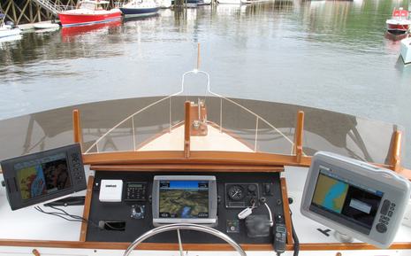 Below, click to enlarge, is Gizmo's upper helm last Saturday, before we began our week-long "research" cruise (a shout out to my sweeeet wife Andrea is due here). You can see that the Broadband Radar connected to the Simrad NX45 is at 400' range and resolving Camden Inner Harbor quite well (it did even better close in when mounted much lower on Li'l Gizmo)...