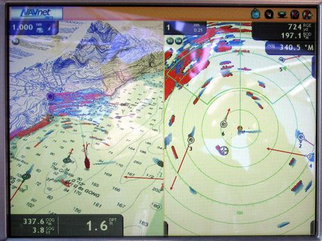 Note that I have set the Raymarine C140W in True Motion mode, which means my vessel moves across the chart instead of the chart moving under it. The C Wide won't do TM in my preferred Head Up mode, but I've gotten used to this North Up display, which resets itself when my boat icon gets about 1/3 from the chart edge. What's truly neat is that target wakes, sometimes called echo trails, reflect the target's true motion, as opposed to their motion relative to my boat, and stationary objects don't make trails. Now in this particular screen I have the wake time set too long, which is messy, but you can see how some big targets far ahead are slowly moving my way, while one closer is moving away, and a smaller vessel (light blue on the true color RD418HD scanner I'm now testing) zipped across my path. You can even see that a schooner off to starboard just tacked and a small boat now near Curtis Island came out into the Bay and did a 180. You can also see Raymarine MARPA in action, here showing each vessel's true course and speed. In normal Relative Motion, Raymarine plotters display a MARPA target's relative speed and motion, which is unusual and takes some getting used to (more on that later).As with many advanced radar features, Furuno is a step or two ahead, able to display True Echo Trails even when your radar or radar overlay displays are set to Head Up and Relative Motion. Both are illustrated below. Note how The Graves (a ledge that looks like a row of tombstones!) and its Gong show no trail, which they shouldn't, but how the speedboat just crossing my stern shows a long trail. Furuno gives the user almost infinite control over these trails -- time length, graduated or solid color, which color, etc.