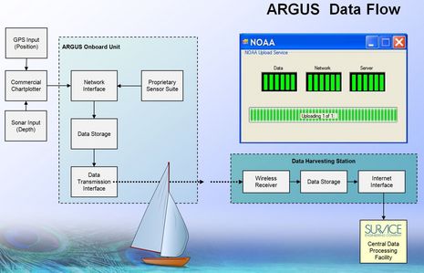The concept is pretty sensational: The ARGUS (Autonomous Remote Global Underwater Surveillance) system would equip volunteer vessels with a custom WiFi transceiver that is connected to the nav system for GPS and depth, and that can automatically upload the resulting data files (when possible) to a shore server where it's collated and quality controlled before being turned over to NOAA so it can better manage its dredging and charting responsibilities. If it all works out as hoped, the volunteers might even get the equipment for free and be able to use the WiFi connection for their own Internet needs...
