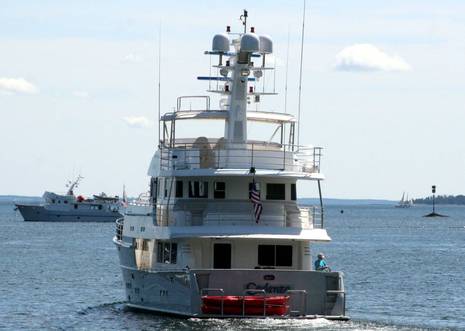 Well, I believe that's a Simrad weather vane on the N76, but I'm a bit confused by some of the other things I see (or don't): Where is the sat compass? That flattened dome looks too big to be an SC-50. Aren't the "blue-stripe" open arrays early Navnet 2? And how is it that that aft sat dome won't be covered in soot from the main engine exhaust -- unless the reason I don't see an exhaust tip is that this boat is a wet-exhaust twin, possible in a larger Nordhavn?