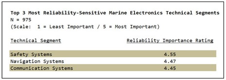 This is a performance-demanding, enthusiast market, so lets start with reliability rating. The top three technical segments, in terms of the average importance given to reliability when selecting specific marine electronics systems included: