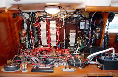 How about a big thanks to Jeffrey. And I'm throwing in a final shot behind that handsome main panel with the Diamond Audio speakers, largely because I've been spending lots of recent hours with typical cruising boat wiring complications like this. I thoroughly understand that they exist to support the gadgets we love, but, man, don't we need a simpler way? -- Ben