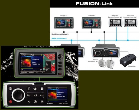 The 700 series stereos -- there's also an MS-AV700 model with a DVD player inside and an optional iThing dock, quite like Fusion's 600 series -- are the first to include something called Fusion-Link. The idea is vaguely like the Simrad/Lowrance SonicHub (which Fusion builds), but now any marine electronics manufacturer can license Fusion's SDK and put full 700 series control on their device via Ethernet. And that means they can compete to design the niftiest MFD audio video interface. And, yes, the 700 series can output iTunes video just like SonicHub can, plus DVD video if you have the AV model. (What I don't think it can do is stream audio or video over Ethernet, but I'll bet that's on Fusion's development road map, along with the multi-sourcing.)