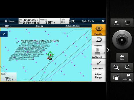 Obviously both RayControl and RayRemote have a virtual keypad that should already be quite familiar to a c- or e-Series user. While of course the "uni-controller" knob and joystick are not as tactile as the real thing, they're surprisingly close. The knob glows red in response to finger turning and, as I tried to illustrate in the collage below, the joystick "moves" as you push the cursor and/or chart around. (Also glimpsed below is how Navionics "Freshest Data" has brought many detail improvements to lake maps like my local Megunticook.)...