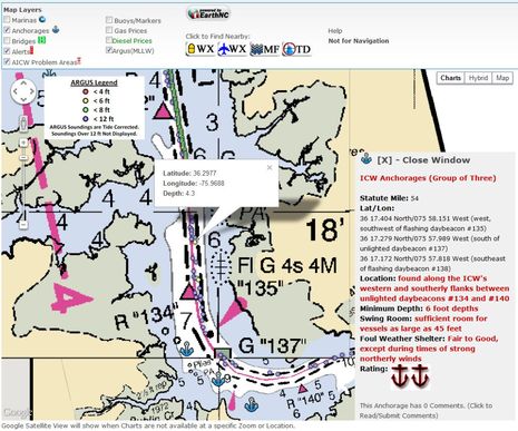 While I was at it, I checked out the current Navionics data for the sample section of the ICW and was pleasantly surprised to find that it was reporting a more realistic dredged area of 5 feet instead of the normally cited 12 feet, but you wouldn't know it unless you click on it. Navionics UGC also has anchorage info similar to what CruisersNet lists, in fact almost exactly the same. I don't know how that happened but I do know that a lot of energetic companies are competing for our attention with cruising data, which seems like a good thing. Have you used these resources, or others a prospective snow bird like me should know about?