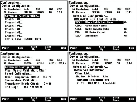 In fact, you can pretty much count on Maretron gear working as well as possible with N2K gear from other manufacturers. For instance, once NMEA finally finishes a set of Standard Power messages (PGNs), I'll bet that the DCR100 relays -- which can also measure current -- will be operable by more than Maretron displays. And consider how a small Maretron system could grow. Besides for various other sensors able to monitor fuel flow, fluid pressures, 12v battery and AC states, etc. etc., Maretron has already developed ways to get this information into WiFi and even off the boat. Note how the DSM150 screen below (lower right) can configure an IPG100 Internet Protocol Gateway.