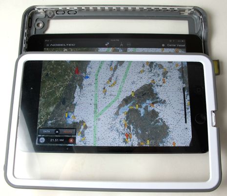 I've been testing three waterproof iPad cases that all have "Life" in their name for some reason (anyone?). Frankly, none got me excited until I recently snapped my iPad mini into the Lifeproof frē case above (running Garmin BlueChart Mobile). The design is stellar, I think. The LifeProof is so light and snug that the mini still feels mini, but it now has a protective rubbery edge and non-slip back; it survived 30 minutes submerged in my sink, yet all the buttons plus the charge port still work fine. I suspect I'll always use this case on the boat and maybe everywhere. That's not to say that I know everything about the ever-changing world of pad cases. Let's review the testing and discuss...