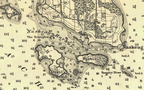 Now look at how well this area was charted by 1885 (click on image to see at the full resolution NOAA offers). I drove Gizmo through somewhat tricky Naskeag Harbor in July and could probably have used this chart (though the use of fathoms for deep water soundings and feet for the shaded shallow areas is a little confusing). Notice how much more topography and vegetation detail there is than in modern charts. How did cartographers pull this off before GPS and aerial photography, let alone before high resolution satellite photo maps?