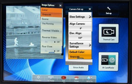 The funky image collage above is an attempt at illustrating the Raymarine interface to the M-Series. As soon as the system was added to the network, the main menu "Thermal Cam" button worked, and I could also create custom screens with "IR Cam" windows (the different default names are a little odd, but custom buttons can be renamed anyway). Now I can pan, tilt and zoom the cameras with the touch screen or with the knob and joystick, which also gives me fast access to the menus. Items you might commonly change, like flipping between thermal and visible (daylight/lowlight) cameras, are on top, but you can dig down to every setup item possible, like how large a sector the automatic surveillance mode will pan, and how fast, or alignment tweaks for the slew-to-cue features.