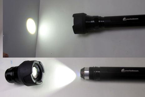 The Ultra Long Range flashlight is big at 13-inches long and it seems to be made well enough to take down a large mammal if used as a club. Marinebeam doesn't make claims about waterproofness, but note the double O-rings where the big lens screws onto the body. The rubber-encased switch is on the tail end and cycles between full power, half power and a strobe function that would definitely get someone's attention if your aim is good. The heart of the beast, though, is the little LED assembly you can see next to the batteries. It uses a technique called Recycled Light Technology (RLT) to multiply and collimate the relatively modest 300 lumen LED chip into a beam with a rated usable range of 650 meters, which might normally take 2,800 lumens according to Marinebeam's detailed write-up.