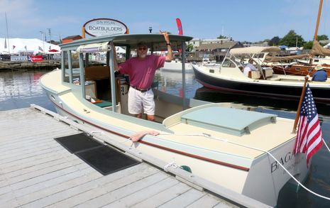 Bless my eclectic boating heart, I can also picture myself happily tooling around on this stylish weekender designed, built and displayed by the venerable Doug Hylan. There's actually a practical and fairly efficient 60hp Evinrude E-Tec outboard mounted under that hatch and Doug used sheathed strip planking and a cored foredeck to keep more traditional wooden boat structure from eating away at the interior spaces.