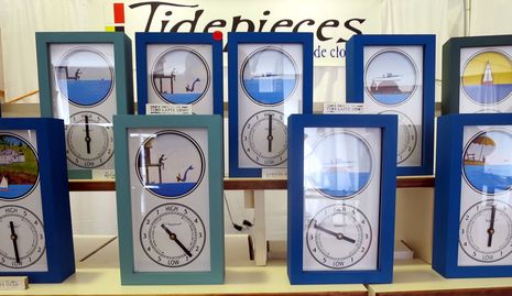 Of course, I've skipped a lot of handsome and beautifully crafted Maine-built boats in favor of the more unusual sights at the 2014 MBHH Show and also many interesting exhibits in the tents. But I will close with one neat gadget I'd never seen before. Tidepieces aren't just tide clocks with a clever illustration added; the water level "in" the illustration raises and lowers with the real tide level as nicely shown in this video.