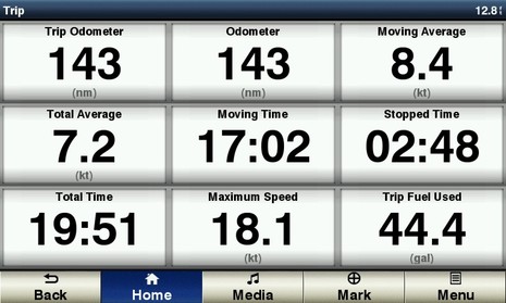 I don't know why, but you can only start the Ray fuel manager when you've done a fill up (and already set up the tank capacity). I did all that in Rockland, but somehow the manager got reset somewhere along the road; it may have been operator error, but I won't be able to get it right again until I do a full fill. However, my extensive paper records indicate that Raymarine can count fuel flow well and, like other displays, their MFDs can also calculate range and/or running hours at a given RPM. My records are revealing some oddities, too, like the way the Actisense EMU-1 (discussed here) adds engine hours when it's on but the engine isn't running.