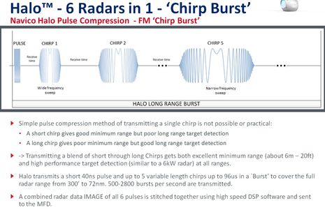 But the question I keep hearing is how can Halo see as far as a 6kW magnetron radar, and while Simrad has already hedged a bit with their "good to excellent" long range self-rating, here's how it does what it does. Apparently, Halo's compressed CHIRP pulses are so Coherent (in the radar engineering sense) that they "can be added together to increase total energy on target"...