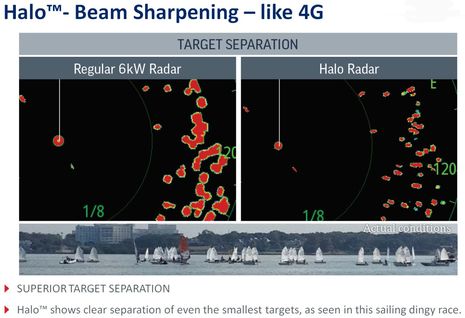Halo tries to combine the features of magnetron pulse with those of 3G/4G FMCW, and I find it reassuring that Navico humbly terms 3G/4G long range performance as "adequate." That's been its Achilles Heel. I also note that they're calling Halo's long range performance "good to excellent." I know they did extensive A/B testing with the best open-array radars from all the major brands, and I gather that it's not quite as good as some at distance. However, I think you will be impressed with some of the screenshots way below.