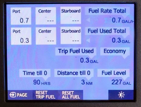 Finally, there's a fourth screen that can display the fuel burn of up to three engines with flow totals and MPG calculated by the EGM and fuel level based on one tank level sensor. (Remember, if you have fuel flow, you may have two ways to tell how much is left.) There's a lot going on under the EGM's hood, though in fact it's only a version of what Veethree makes available to OEM engineers as the Veecan 320 customizable display (via master distributor New Eagle). I believe we've seen the underlying 320 elsewhere in marine electronics, like this Offshore Systems tank monitor, but if you want the EGM model, the best source seems to be a dealer with a Gemeco account (and expect a retail price of about $700).