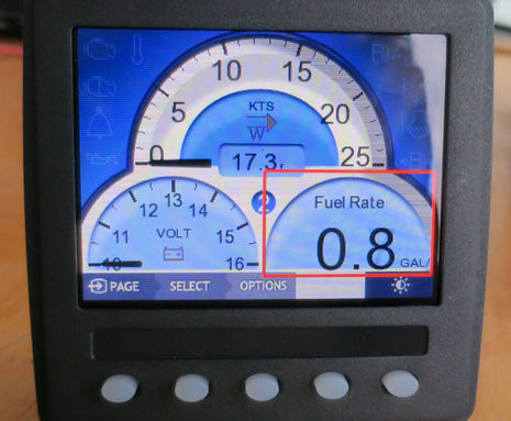 The EGM offers three gauge screens, all the same design except that you can easily make each one unique by stepping through the three "dials" and the numeric window selecting whatever data type you want from the available sources. So in the screen above I've "Selected" the lower right dial and am using the "Option" button to choose between Fuel Rate, Oil Pressure, etc. By the way, if you click one of these screen images bigger, you'll see the many "trouble light" alarm icons that can often be triggered by J1939 or N2K engine streams (but usually aren't sensored on analog engines).