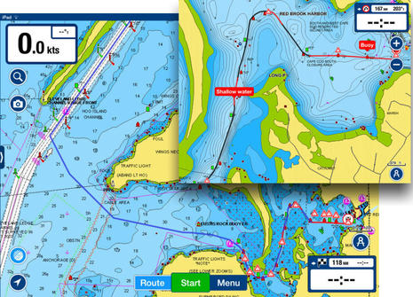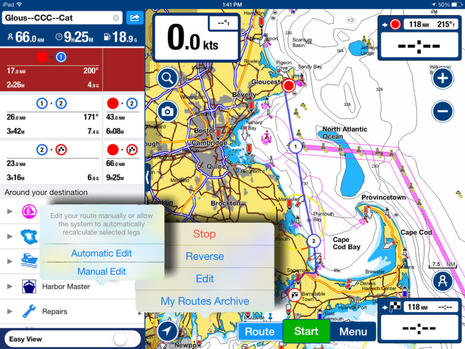 You can also easily edit a Dock-to-dock route after the calculations, or later. (And if the route you're returning to was originally made manually, you're given the choice of keeping it manual or turning it into automated.) In the case above I was completely redoing the Gloucester to Cotaumet route on my wife's iPad Air to see if it was much faster than what happened on my own 1st generation iPad mini. Dock-to-dock is much faster on the newer Air, and is probably much faster still on the latest generation of iPads (comparisons here). My added waypoint #1 is simply there to give me a heads up to the shipping channel, but #2 is to correct a relatively small glitch I saw regularly in Dock-to-dock...