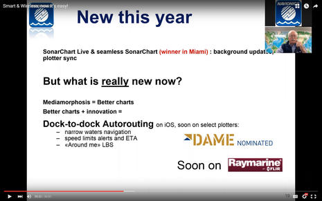 To learn more about Dock-to-dock autorouting, and also the bigger concept Navionics calls Mediamorphosis, check out this recent webinar (skip to 19:40 if you just want to see Giuseppe Carnevale's live Dock-to-dock demo). One feature I have not yet been able to try, for instance, is Dock-to-dock's ability to warn a user about speed limits and even include them in ETA calculations. Also, note on the webinars screen capture above that Dock-to-dock is slated to come "Soon on Raymarine"...