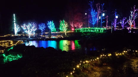 Now let's close with some joyful lighting. Above is the wonderful Maine Coast Botanical Gardens AGLOW -- almost 200,000 LED fixtures strong -- and if you click it larger you'll see that umbrellas were needed that recent night (and many recent nights). A chilly drizzle didn't stop a lot of visitors; maybe such weird winter weather, and the possibility of a sick climate, increases the need for such luminous color? And below is a summer evening scene at the Camden Public Landing. It's hard to photograph lighting well, but hopefully this suggests how beautifully symmetrical and balanced these lights looked. I had to grin because it wasn't that long ago that a fellow member of the Harbor Committee suggested that we ban underwater lighting at the Landing. He got no support whatsoever. Wishing you all a light-filled winter solstice 2015, natural and otherwise.