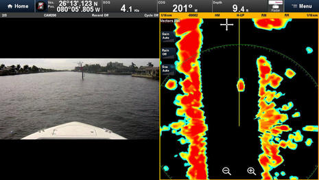 Here's Quantum set at its minimal 1/16nm range -- equal to about 380 feet or 115 meters -- nailing a daymark roughly 190 feet ahead. Raymarine claims 18 feet as a minimal target distance and I think that's plenty good enough. Note the very clean target imagery here and below, all with gain and sea clutter controls set on auto, and also how the test boat's Cam200IP visual light camera (discussed here) can pair neatly with the radar, as could the thermal camera. That boat has eyes!