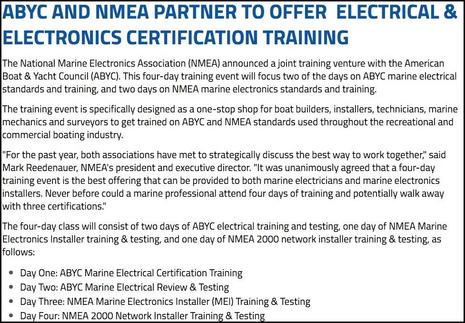 The American Boat & Yacht Council (ABYC) and National Marine Electronics Association (NMEA) are offering certification courses in marine electrical, electronics installation, and NMEA 2000 networking. The first four day course starts May 23rd in Fort Lauderdale with further courses planned in the fall near Seattle and East Greenwich, RI. Members of either organization pay $1195 ($1695 non-member) and lunch is served! Further details are on the ABYC site as well as on NMEA's.