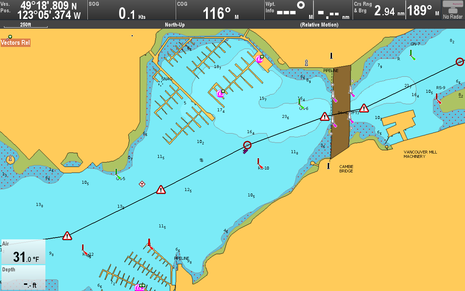 Here's a closer look at the end of fairly narrow False Creek as you move under the Cambie Bridge. Note the triangular warning symbols used to mark waypoints. These are pretty liberally shown after autorouting calculations and are meant to warn you about dangers like shallow water or to check bridge heights. Dock-to-dock does not check your boat's air height, but route calculation is very dependent on your minimum safe depth setting. (To avoid unwanted "Safe route could not be generated" messages, I did all my testing with this set at 5 feet.)