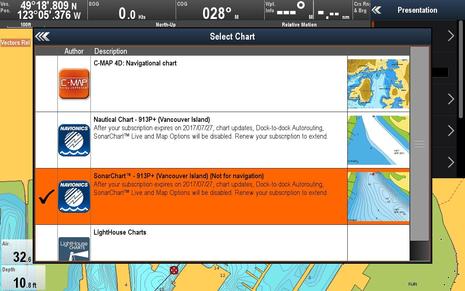 By the way, the charts on an expired Navionics card will still work for all other tasks, and the original Navionics autorouting will continue to work on Ray MFDs until the end of 2016. But as seen on Journey's Raymarine c125 above, I did have the right card to test the new Navionics features during my first cruise of the season.