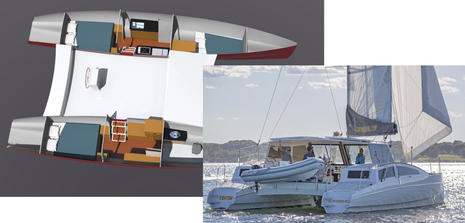 I failed to get a good photo of the 38's immense semi-enclosed main deck and helm, but when I wondered to Dick if this might make a good power cat, he just grinned and pointed at that prototype rendering below. What I didn't add is how perfect the 38 seems for electric power, specifically a Torqeedo Deep Blue Hybrid integrated propulsion and house power system once that's evolved to work with the Torqeedo outboards that could replace the gasoline ones that are the 38's worst feature, in my opinion. Picture fairly quick, nearly silent and redundant electric performance with backup generators and nearly infinite power for the appliances and gadgetry that could make this boat even more comfy (as long as you kept them light). It's just a thought, but one of many reasons to check out the first MC 38 in Newport next week (or even get aboard for a leg to the Bahamas).