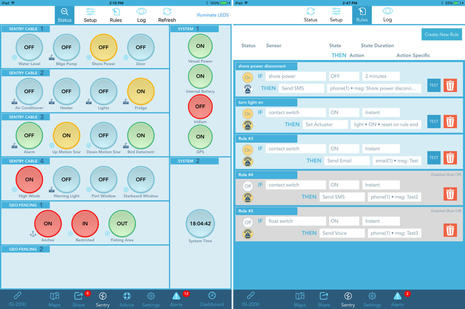 Sentry, which does necessitate an added-service plan, also unlocks geofencing, an anchor alarm, and Mazu pages like the ones seen above (which I got from SkyMate as they are not available in the app without activation). Note the nifty rules-based alerting and alarming, like "If shore power is disconnected for 2 minutes, then send an SMS text message saying Shore power disconnected to the number xxx-xxx-xxxx." I'm pretty sure that it would be easy to set up a loud siren so that you'd learn about anchor dragging or high bilge water in your berth like you would ashore (similar to the on and off board beauty of Nautic Alert).