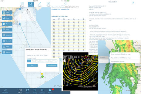 Mazu weather is similar. While inReach can now pack a fair bit of weather forecast into a few short data bursts (details here), Mazu goes a whole lot further, including NOAA resources like graphic analysis, automatic alerts, and NEXRAD radar. You can try all this in the app without mSeries hardware, though you can't see how many KB of data would be used over Iridium or how long it takes for the ISI-2000 to assemble the bursts into, say, that wet image of the West Coast.